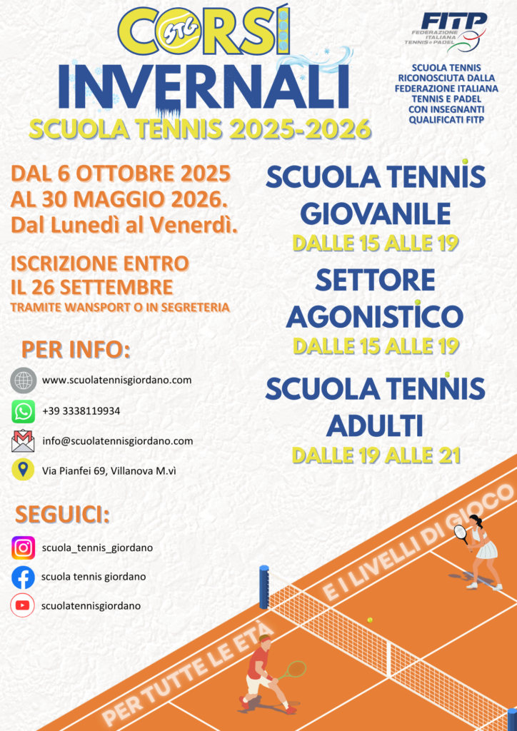 I corsi di tennis sono strutturati in tre percorsi: scuola tennis giovanile, settore agonistico e scuola tennis adulti.